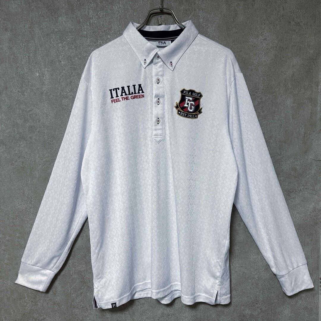 FILA GOLF(フィラゴルフ)の長袖ポロシャツです。ホワイトベースにさりげない総柄ジャガード生地を採用し、胸元のITALIA刺繍とワッペンロゴが上品なアクセント。ポリエステル素材で吸汗速乾性と通気性に優れ、快適な着心地をキープ。3Lの大きめサイズでゆったり着用でき、ゴルフや普段使いにも活躍する一着です。