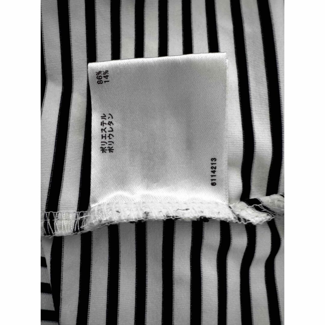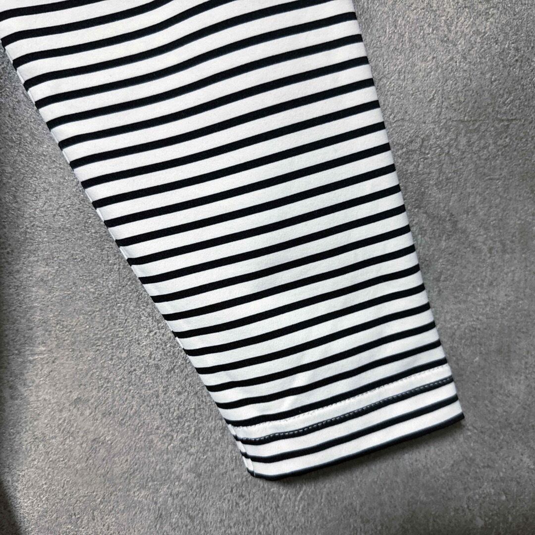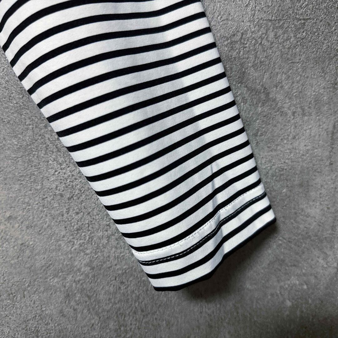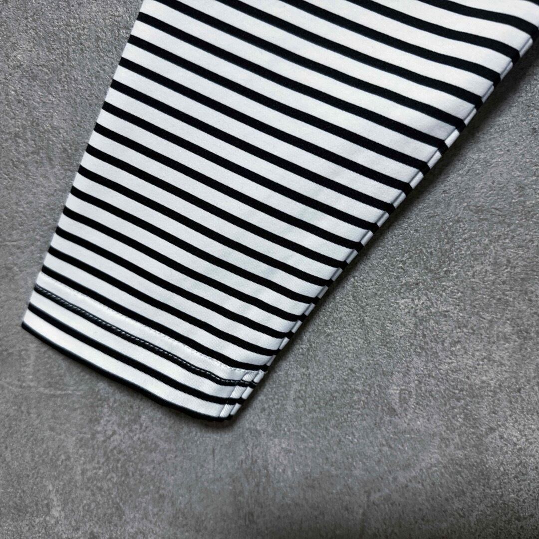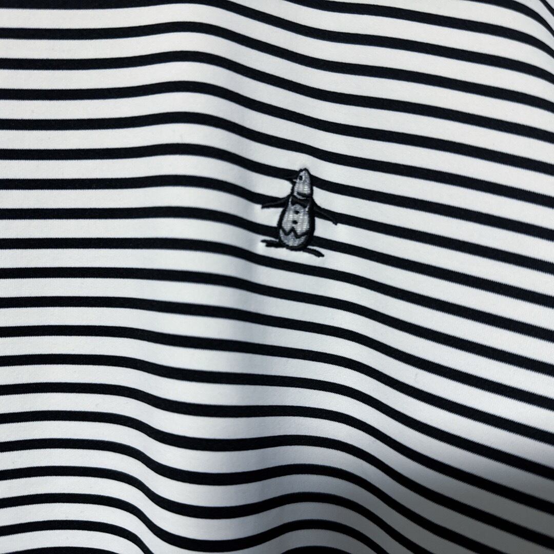 ・Munsingwear(マンシングウェア)の長袖モックネックで、細ボーダー柄と胸元のロゴ刺繍が特徴的なデザイン