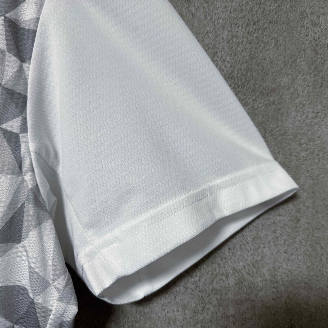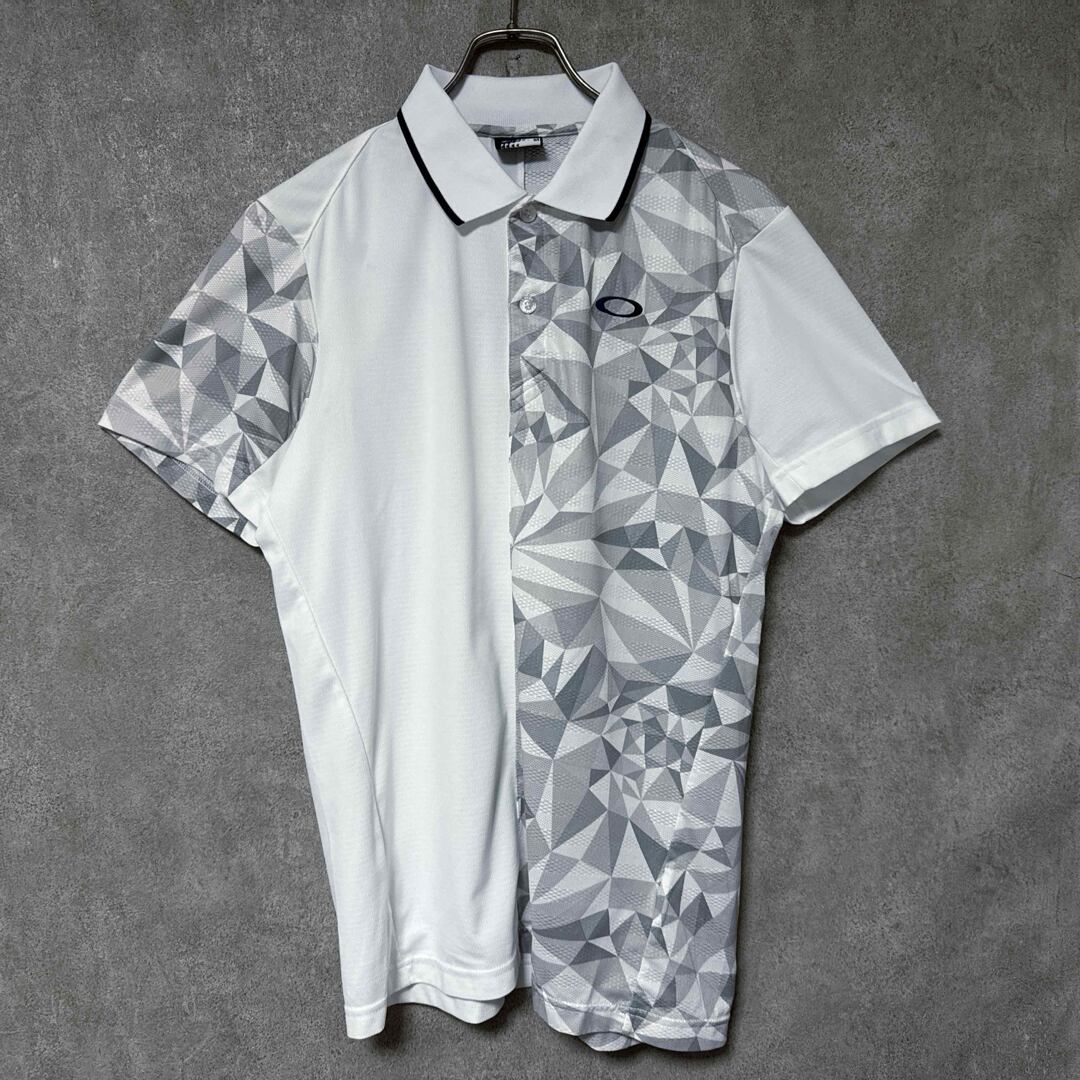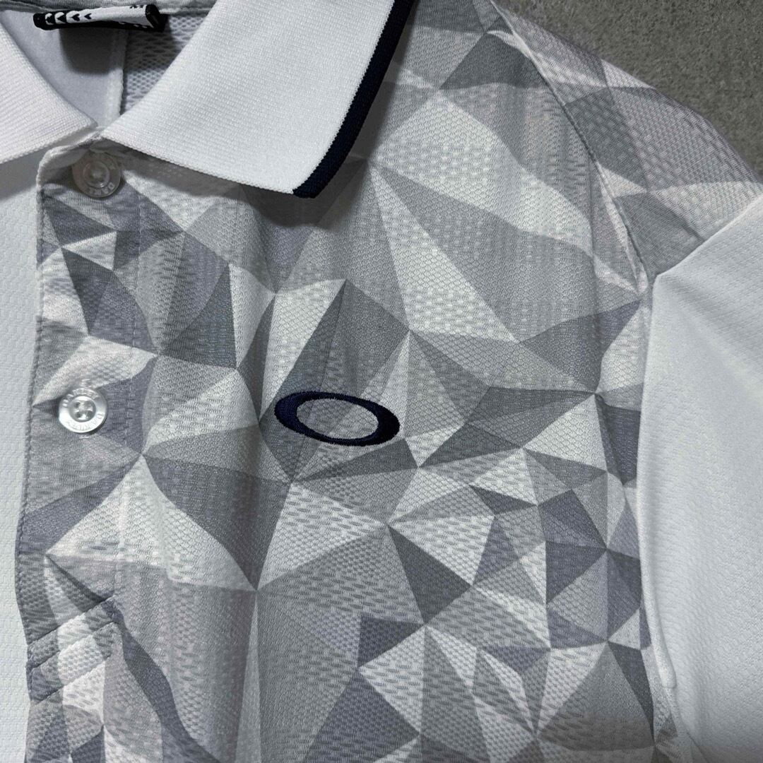 オークリーの半袖ポロシャツ。ホワイトベースに幾何学柄を切り替えたデザインで、シンプルながら存在感があり、ゴルフやスポーツシーンで映える一着です。