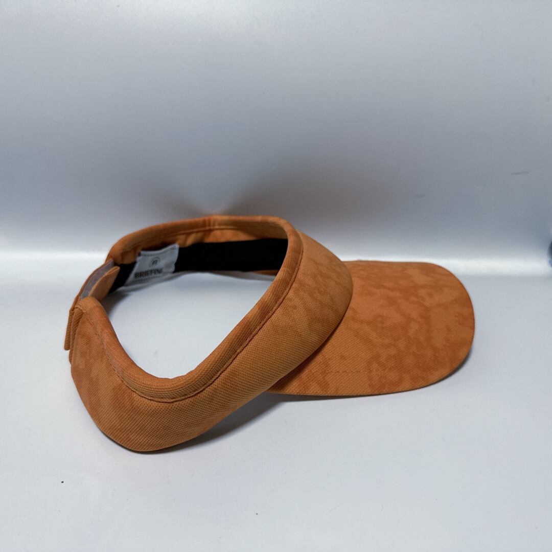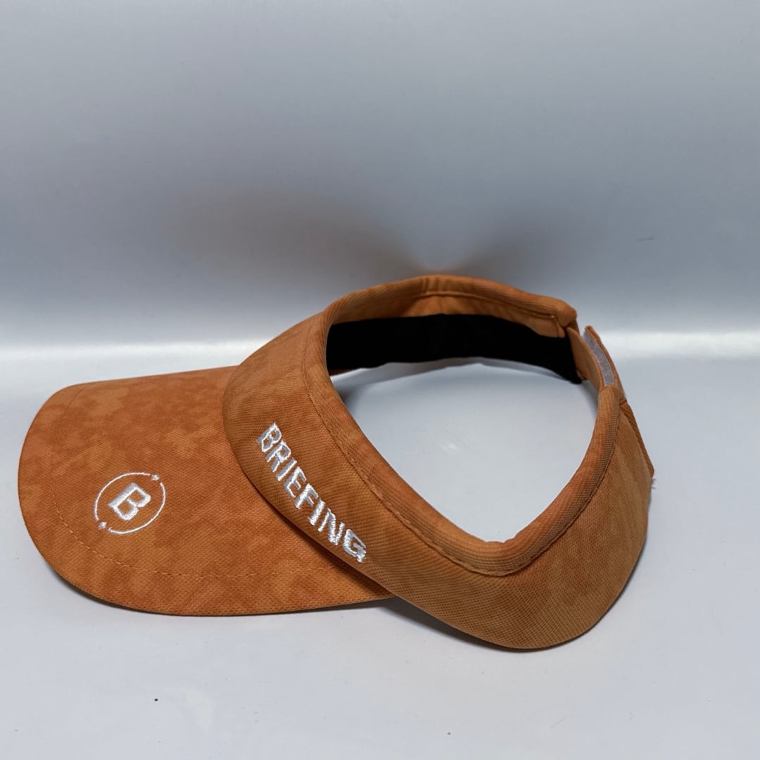 BRIEFINGのサンバイザー。落ち着いたオレンジカラーに立体感あるロゴ刺繍が映えるデザインで、ゴルフやアウトドアシーンで視線を引くアイテム。日差し対策とコーデのアクセントを両立できます。