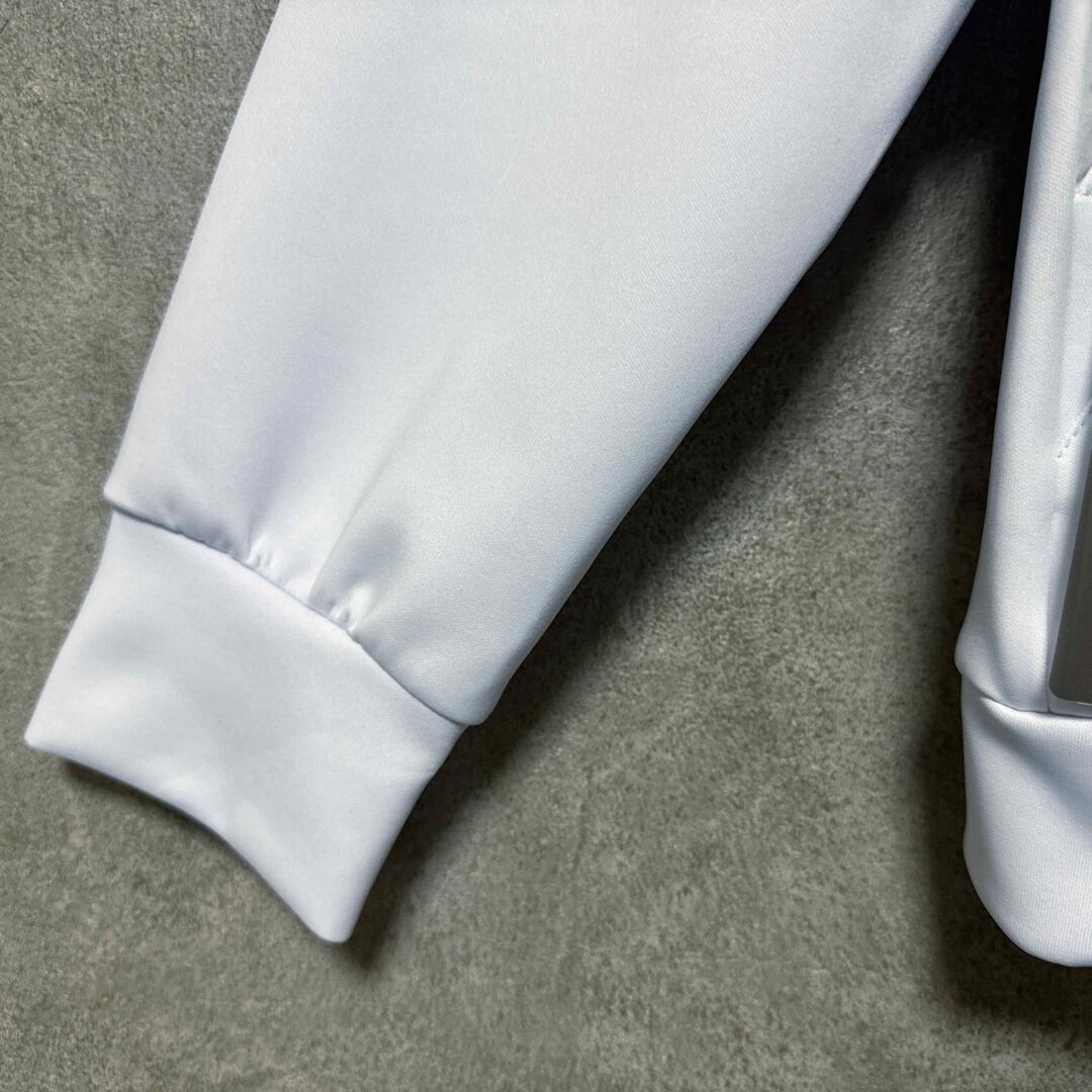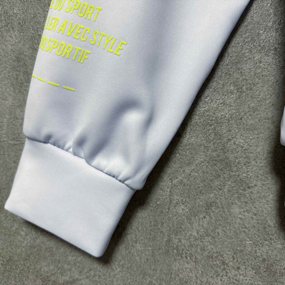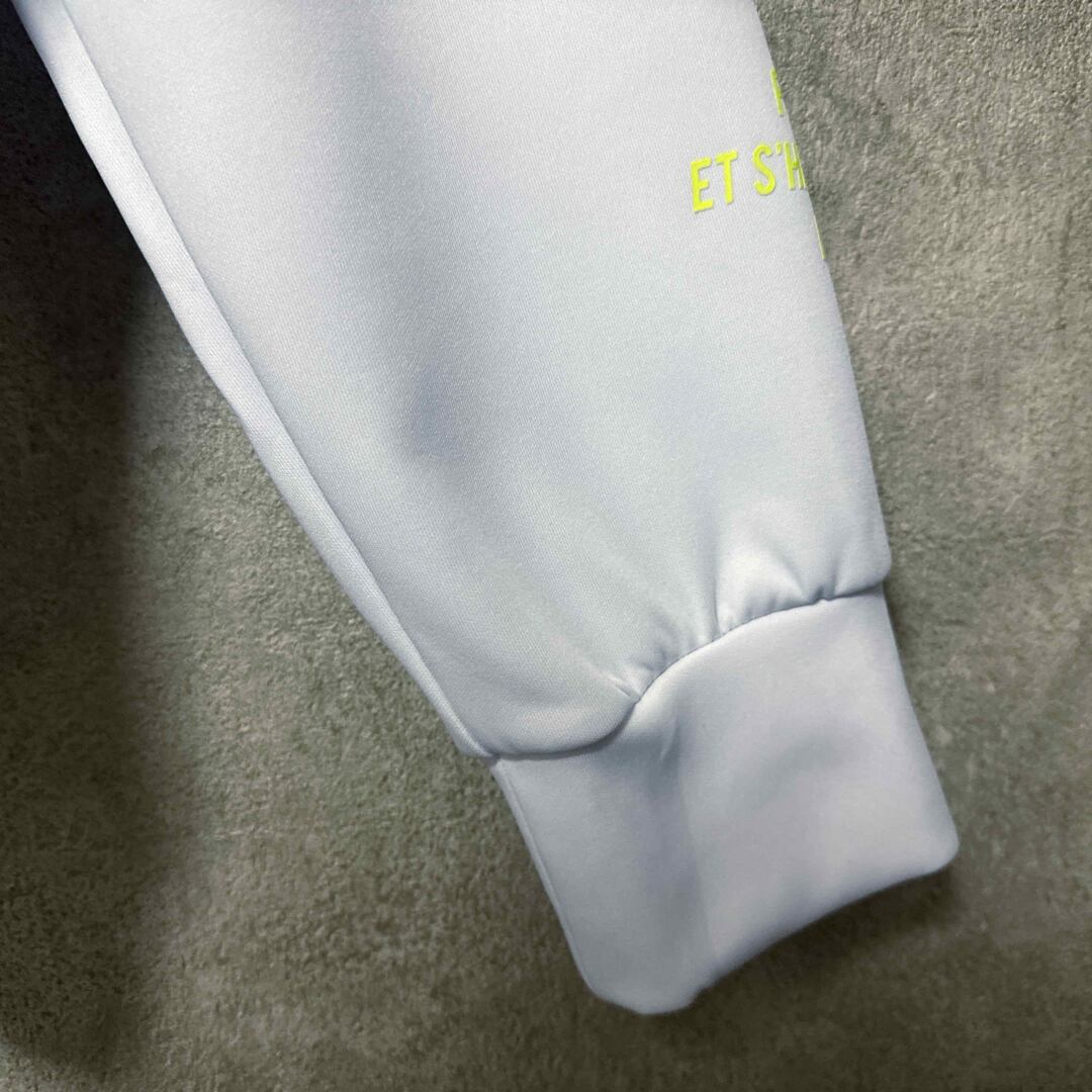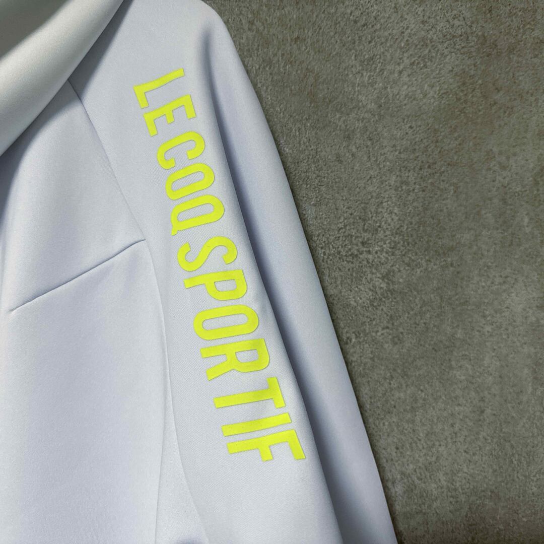 le coq sportif GOLFのフーディーパーカー。ホワイトのミニマルデザインにネオンイエローの裏地が映える一着。軽量で動きやすく、春秋ラウンドや練習着に最適です。