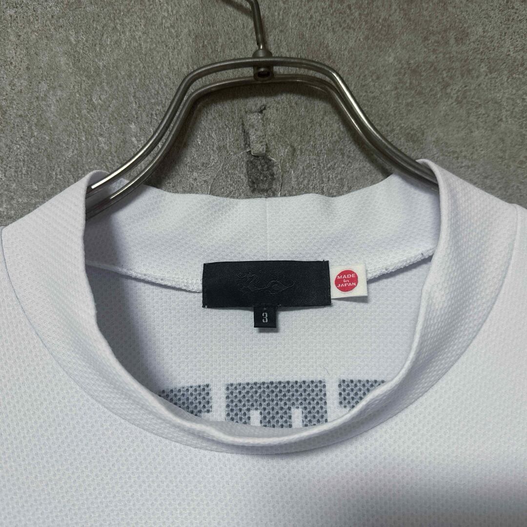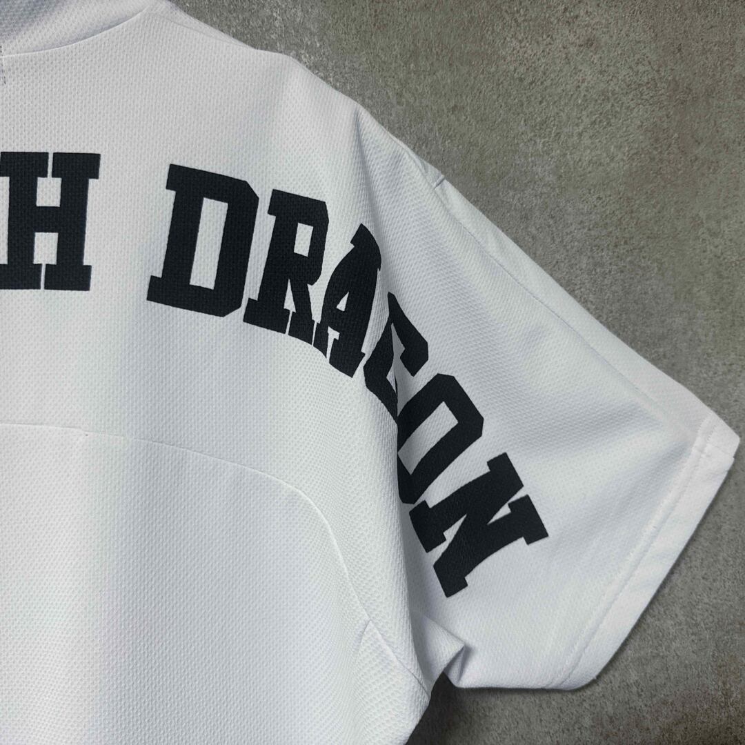 清潔感のあるホワイトカラーに、背面の大きな「DANCE WITH DRAGON」ロゴが映える半袖ゴルフシャツです。
