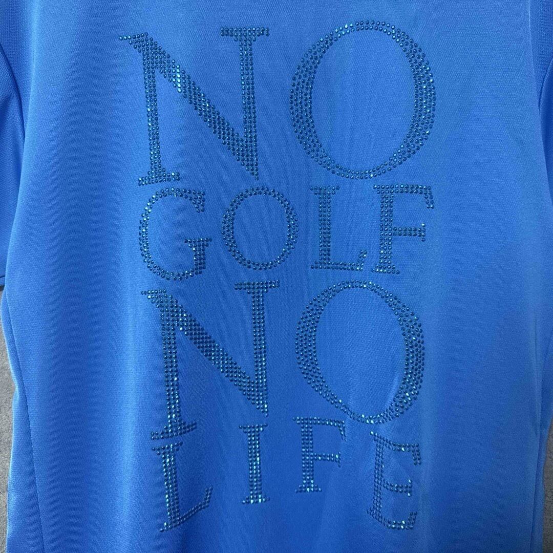 鮮やかなブルーカラーに、ラインストーン風の「NO GOLF NO LIFE」ロゴが映えるRusselunoの半袖モックネックシャツです。