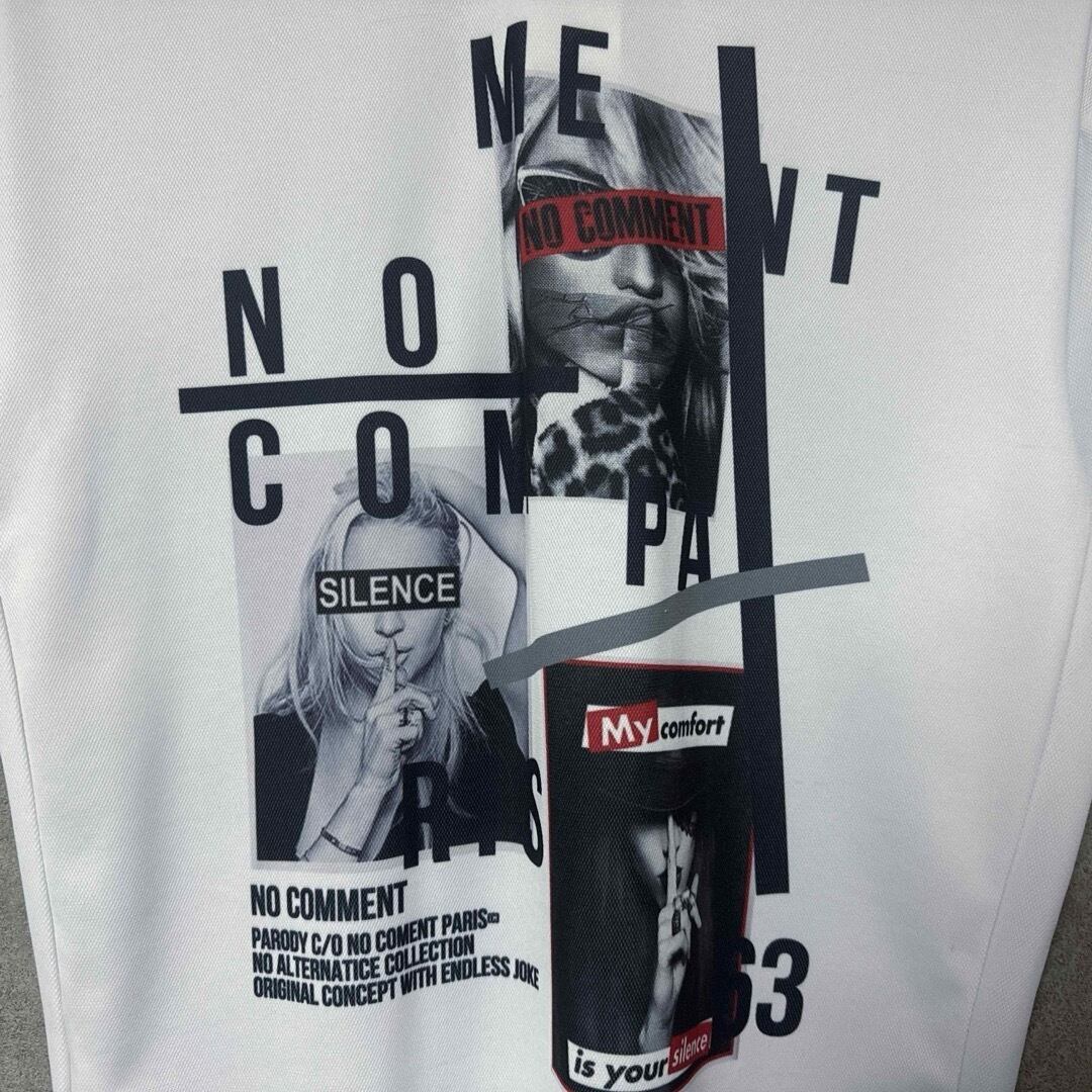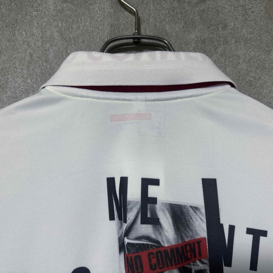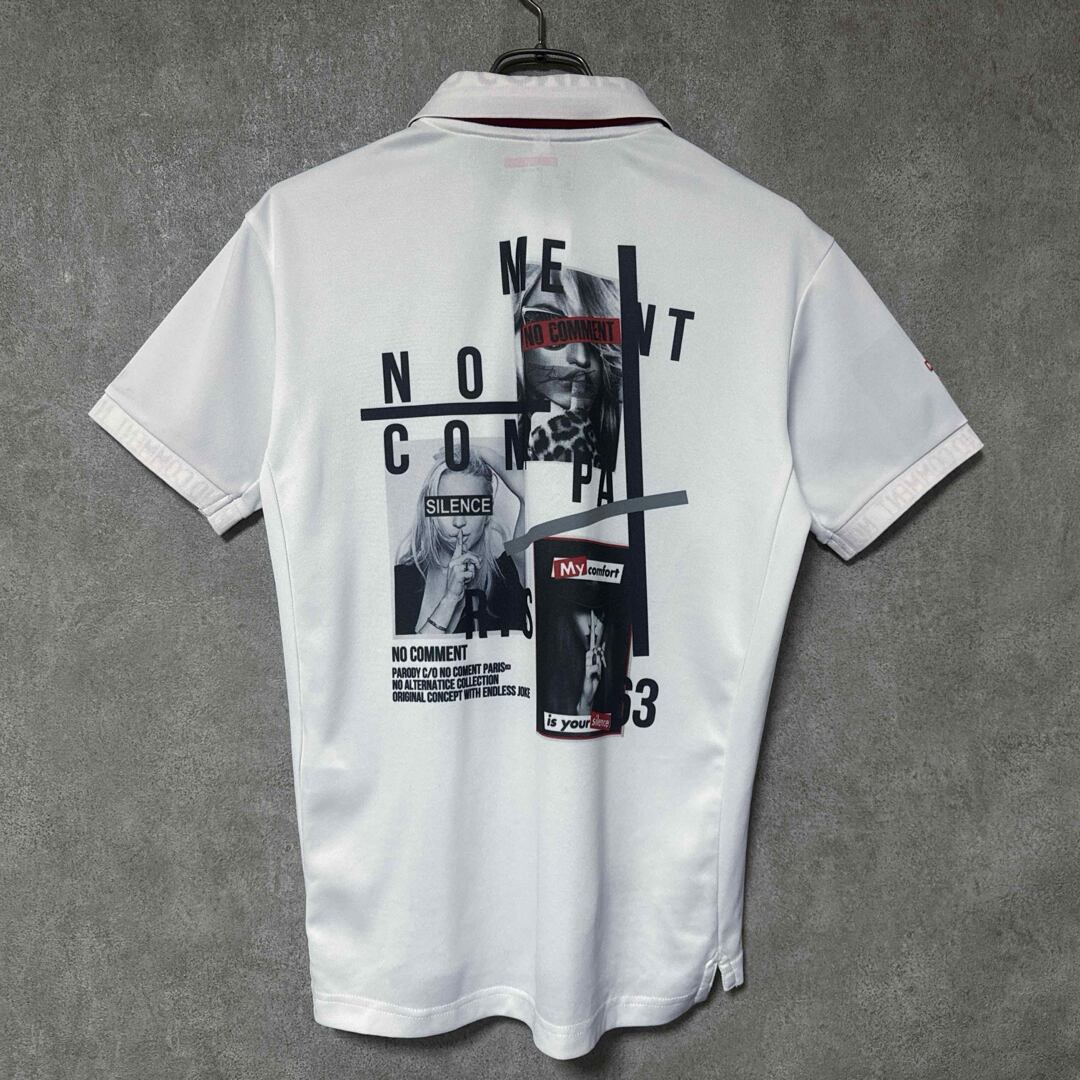 清潔感のある白ベースに、背面の大きなフォトプリントが映えるNO COMMENT PARISの半袖ポロシャツです。