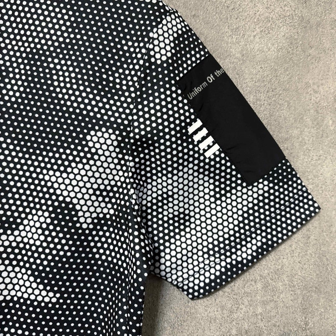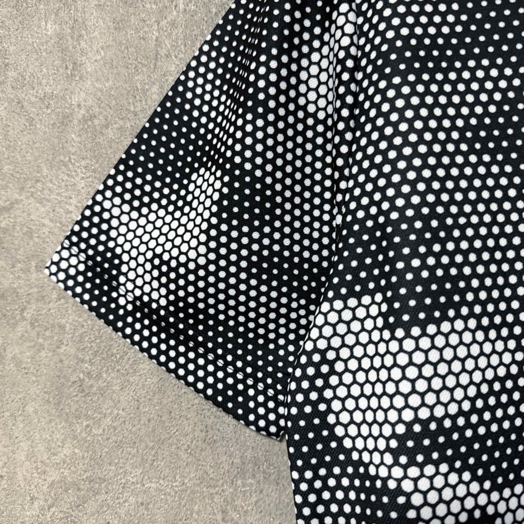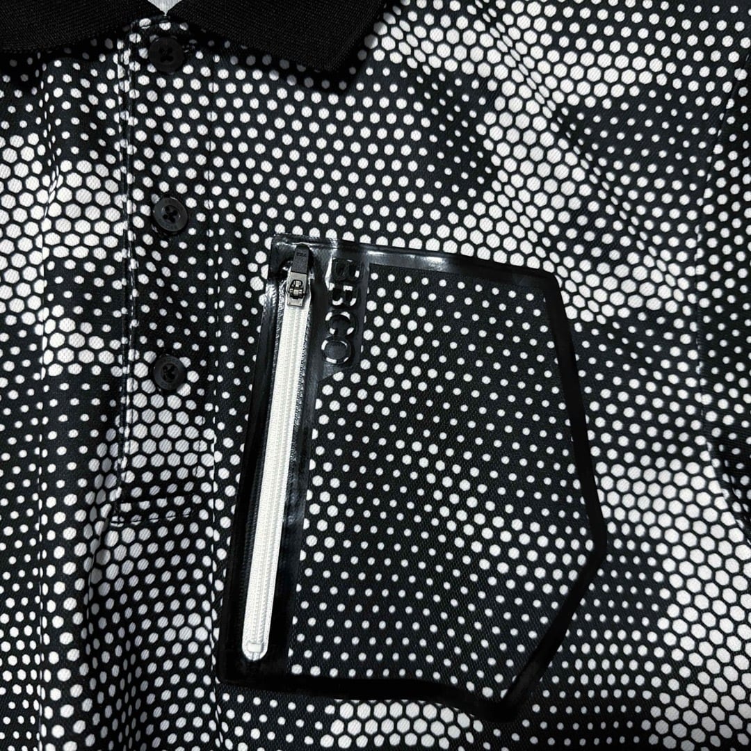 BBCOの半袖ポロシャツです。細かなドットで表現したモノトーンの迷彩風デザインが印象的で、ゴルフ場でも普段使いでも存在感のある1枚。胸元の止水風ファスナーポケットがアクセントになり、スポーティーさとモード感を両立しています。
