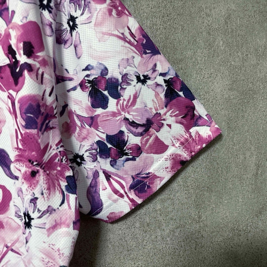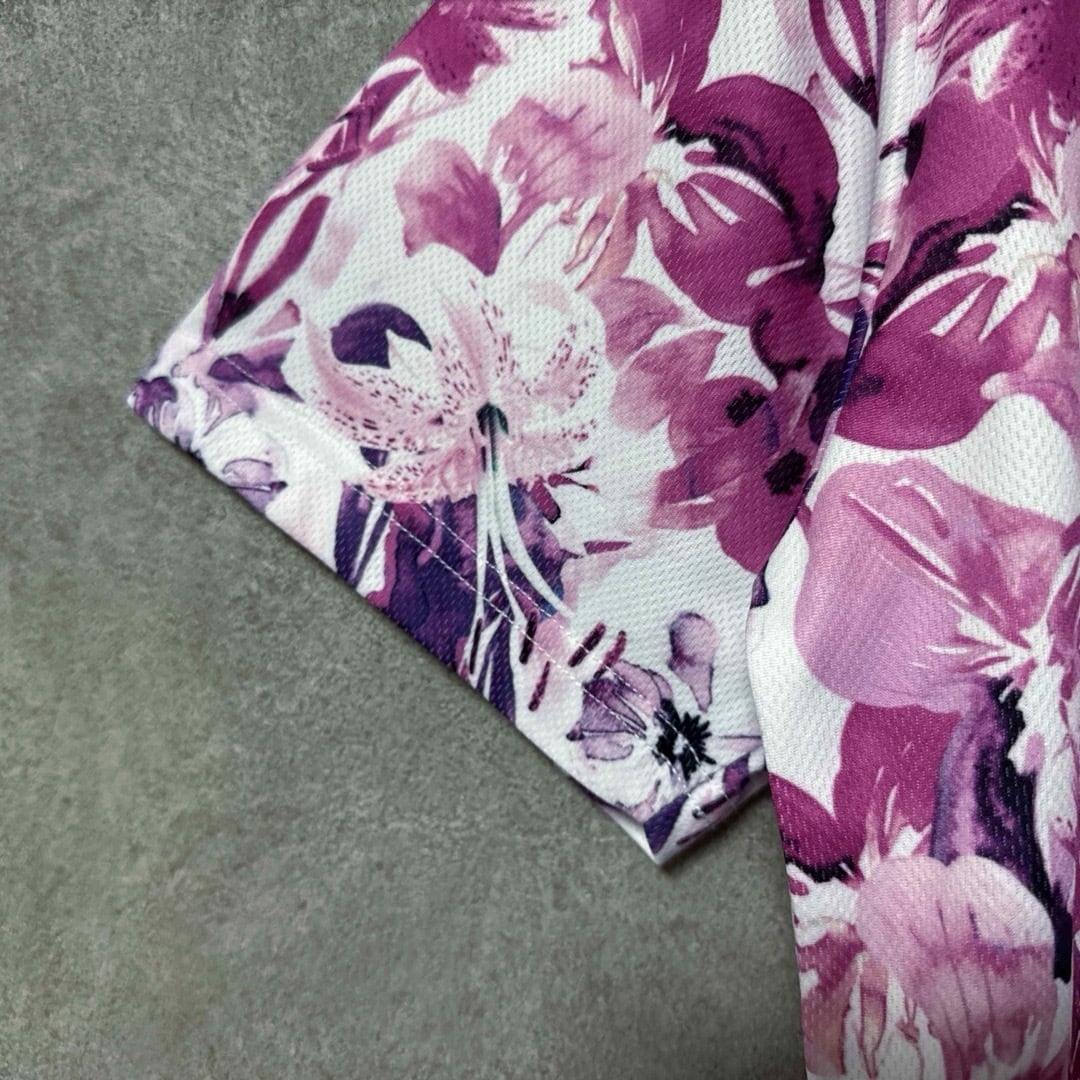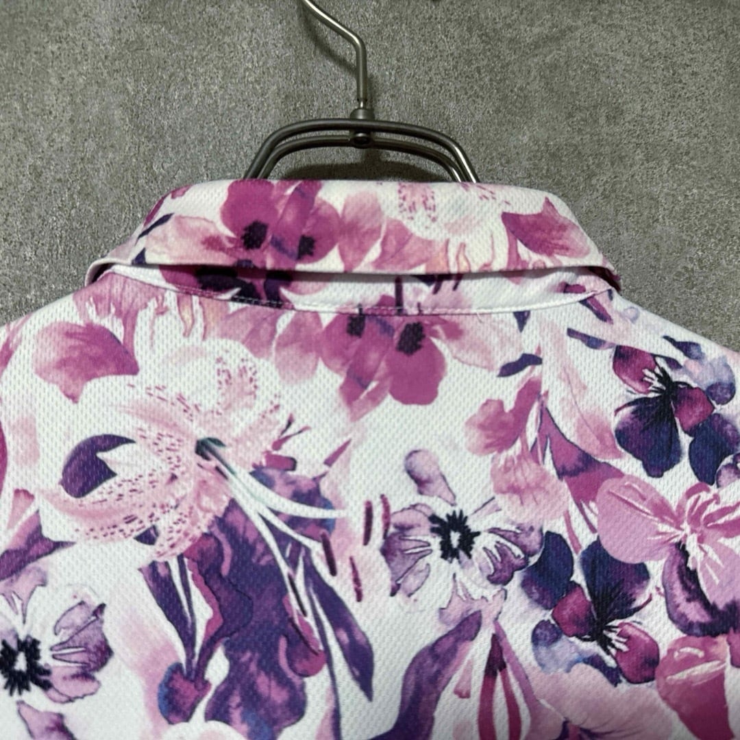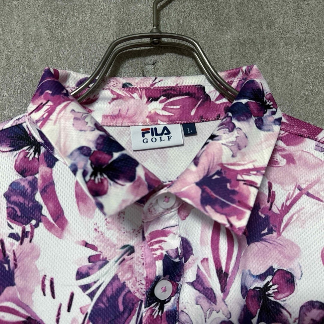 FILA GOLFの半袖ポロシャツです。ピンク・パープル系のフラワー総柄が目を引く華やかなデザインで、春夏のラウンドやゴルフ場映えを狙いたいコーデにぴったり。